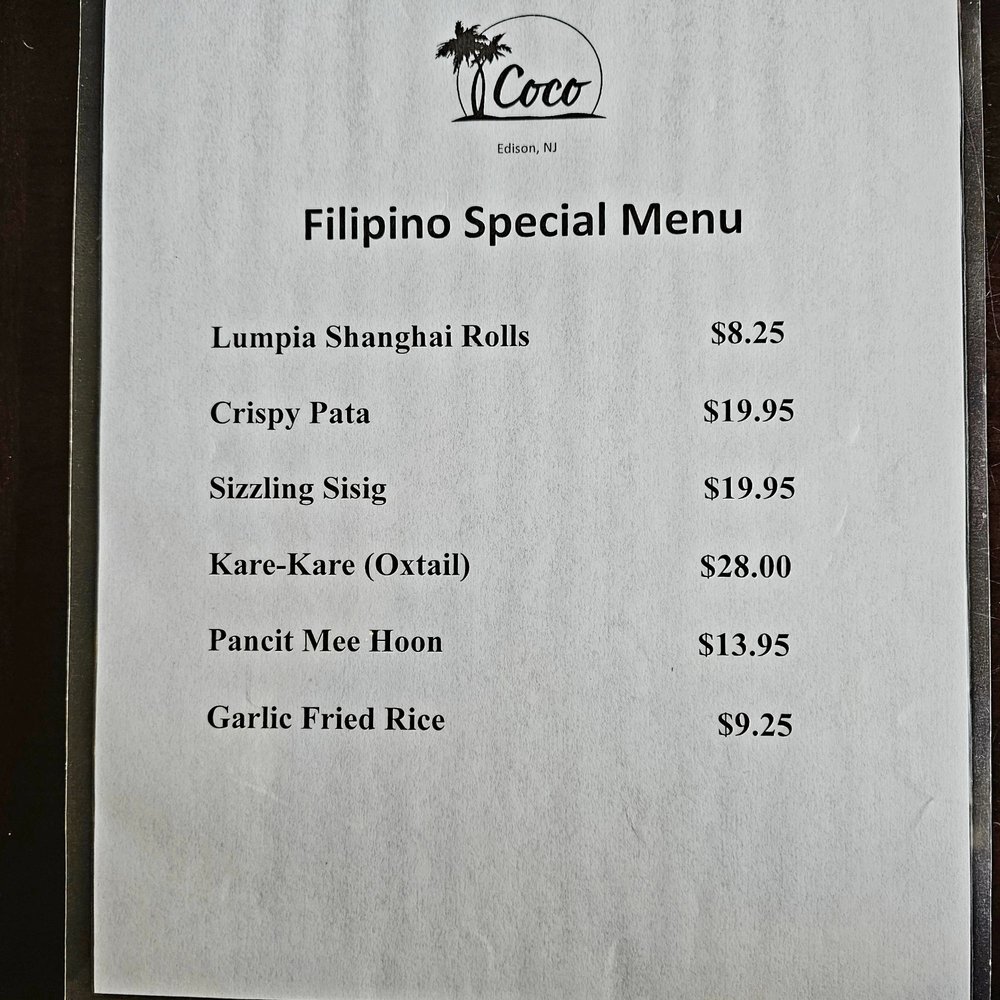 “ Coco is the closest thing to authentic Southeast Asian food in central Jersey. The service is so quick- your food will take no more than 15-20 mins to come out. Our go to dishes are: +Hainanese chicken rice- the rice that's paired is actually chicken flavored like the OG. +Coco house special tofu - fried egg tofu with squid, shrimp, and veggies +Salt and pepper pork chop- so crispy and flavorful +Kang kung belacan -spicy water spinach stir fry +Kuay teow- delicious stir fried rice noodles Coco also has a separate menu for Filipino food. Ample parking in the back. Hot tea is on the house. Spacious restaurant for group dine ins. ”